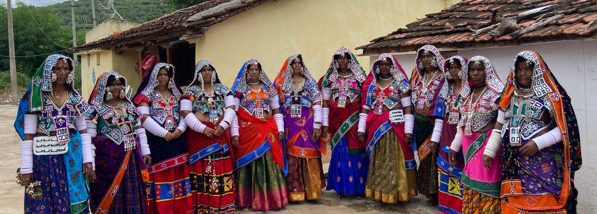 Alamwar collaborates with craft clusters near Hyderabad, Telangana, where the Banjara establish "Thandas" – self-contained communities outside villages or towns with their own leadership structures. We've been fortunate to expand our work with these skilled artisans. Banjara women visit our workshops, co-creating new designs and prototypes that they share with their wider community of 300 embroiderers.